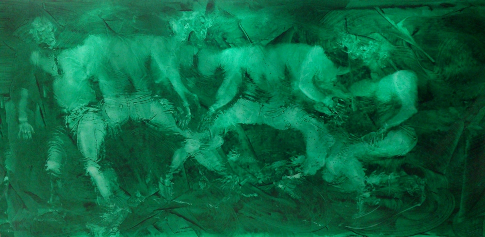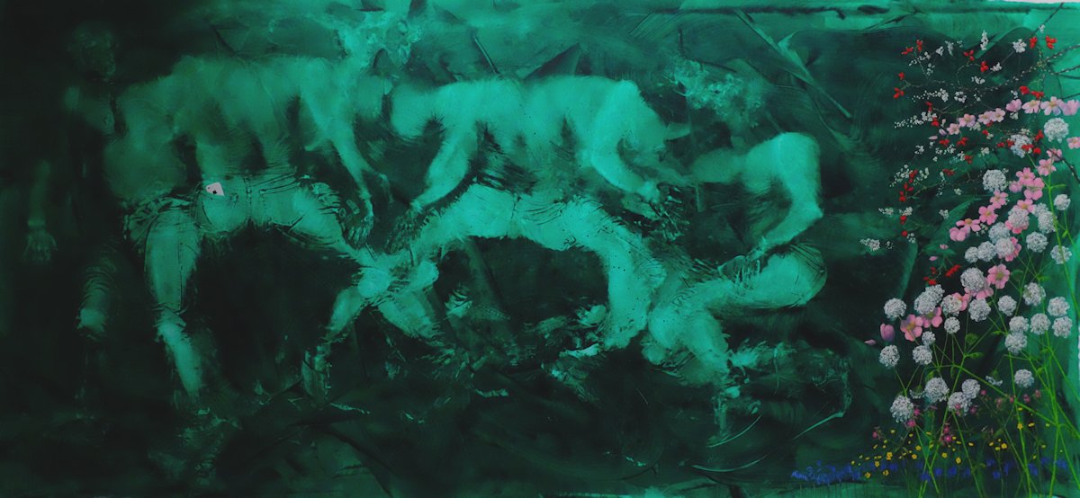 A version of the Expulsion from the Garden of Eden. The first image is the body print - the artist rolling across the canvas - the second image is the finished painting with a rich variety of English hedgerow flowers. The flowers represent Eden and the figure represents Adam walking away.